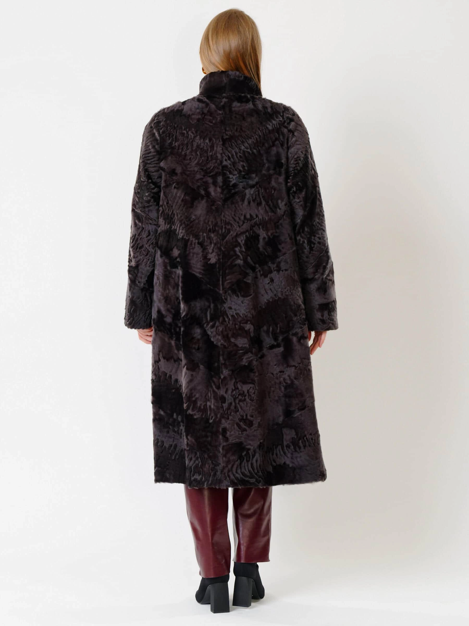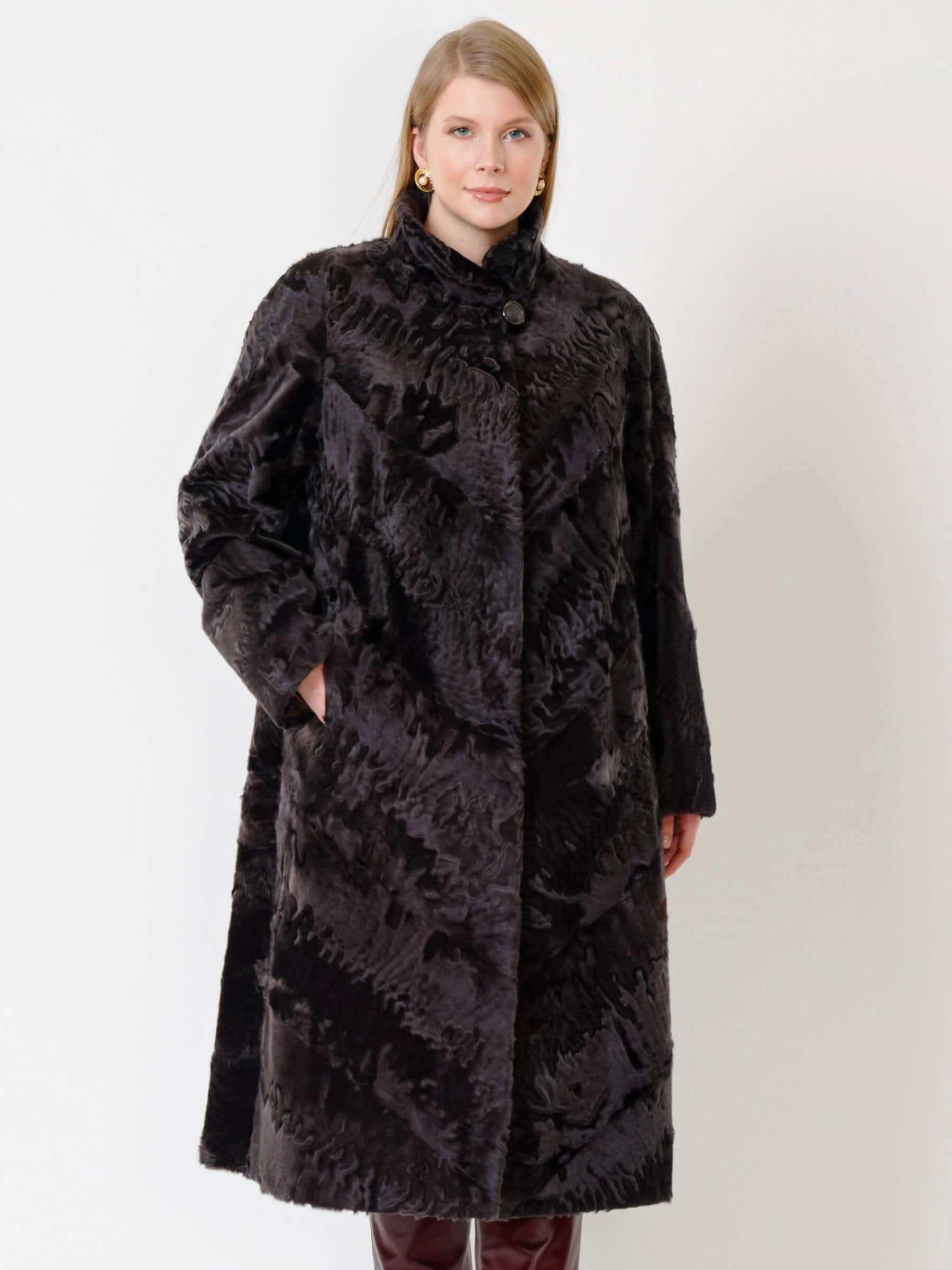 Шикарное пальто из каракуля. Тугой плоский завиток волоса каракуля. Великолепное качество меха. Ювелирный подбор шкурок по оттенку и структуре волоса. Аккуратная работа портных. Комфортная посадка по фигуре.