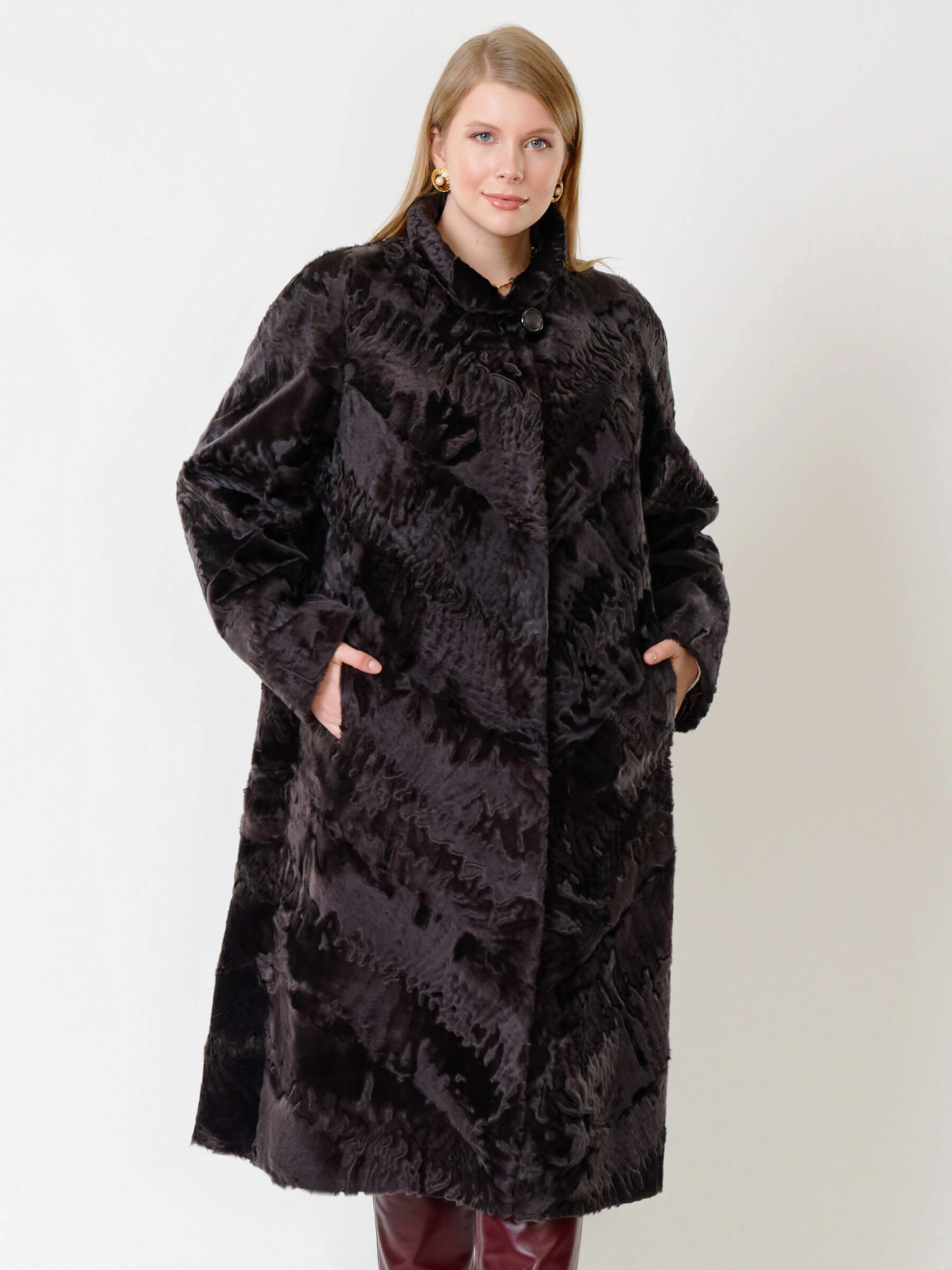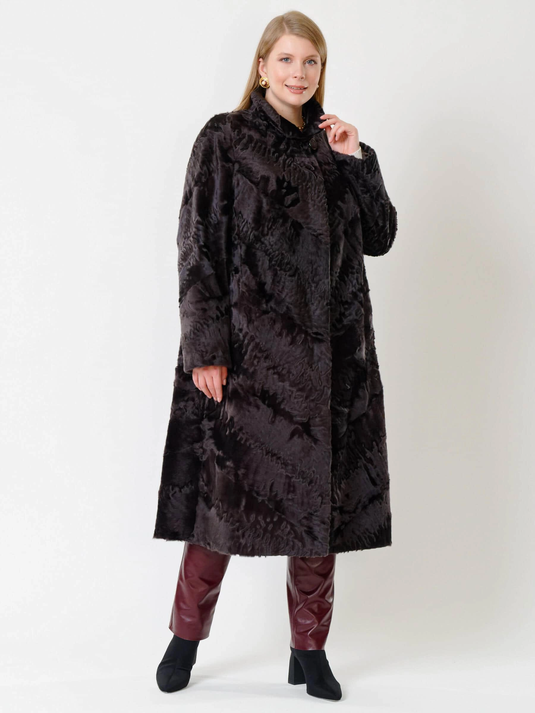 Товар длинная женская каракулевая шуба елизавета(с), коричневая, размер 56, артикул 22680 выполнен из каракуль с застежкой клипсы. Рассчитан на сезон: осень-зима. Длина изделия свыше 90 см, силуэт трапеция.