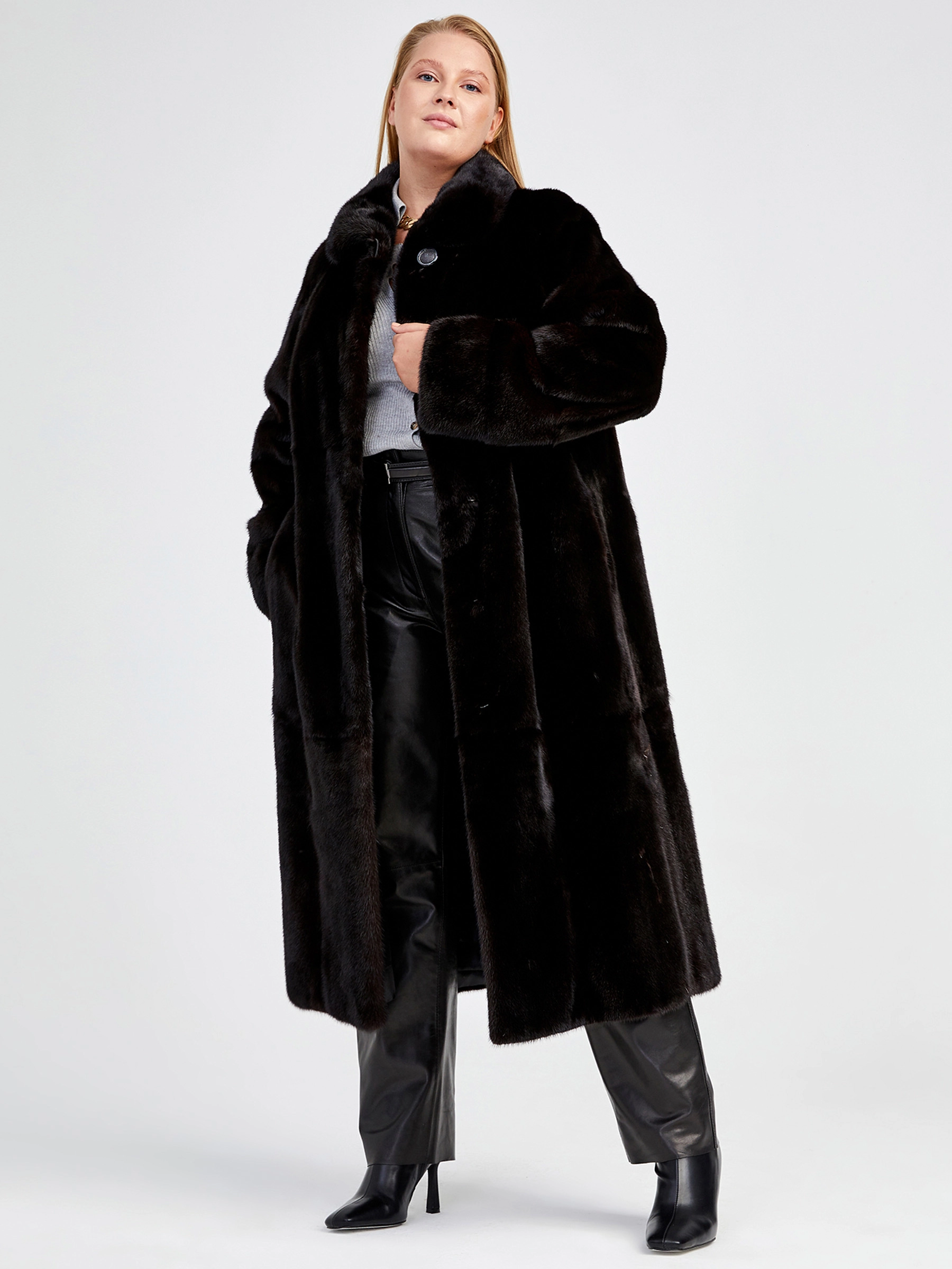 Товар длинная норковая шуба с воротником стойкой для женщин елизавета(в), черная, размер 70, артикул 32910 выполнен из норка с застежкой клипсы. Рассчитан на сезон: осень-зима. Длина изделия свыше 90 см, силуэт прямой.