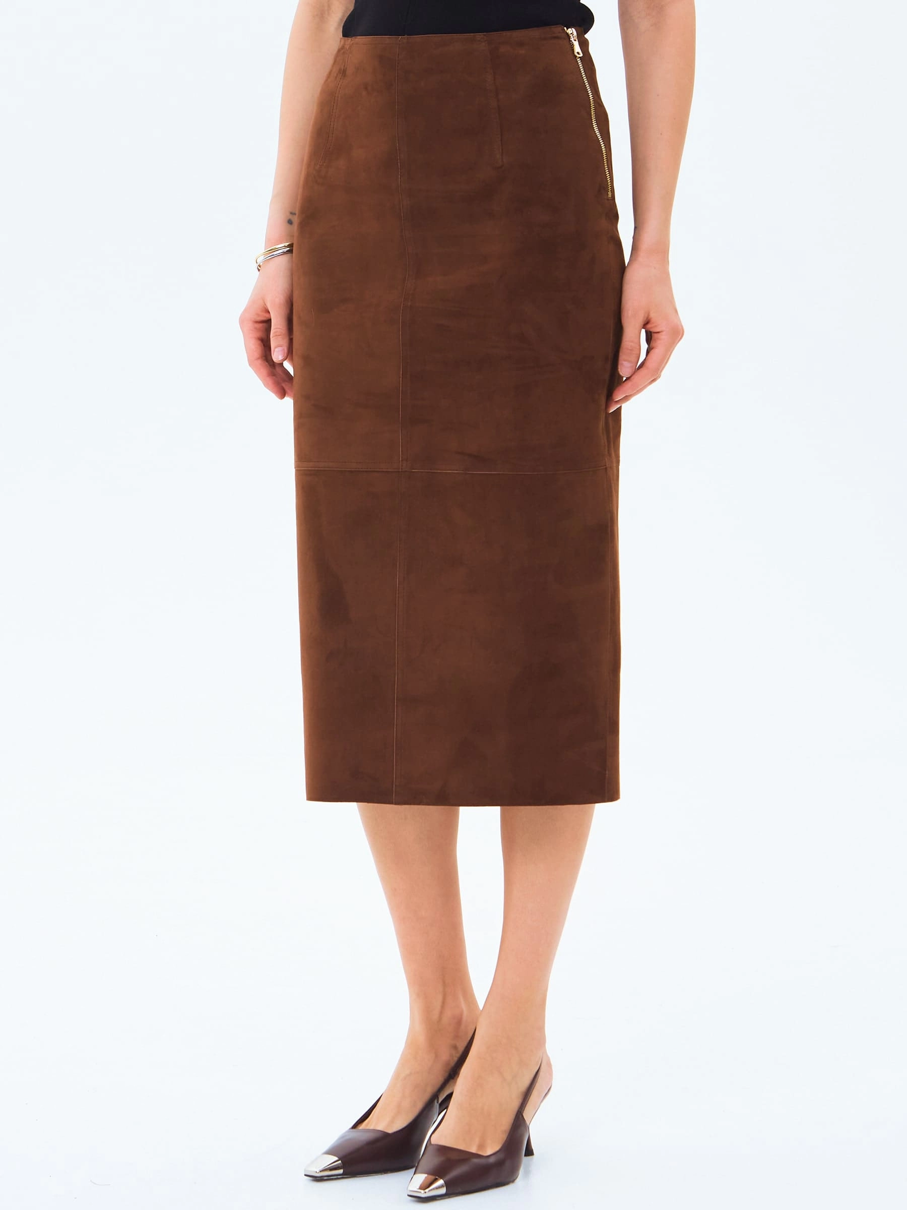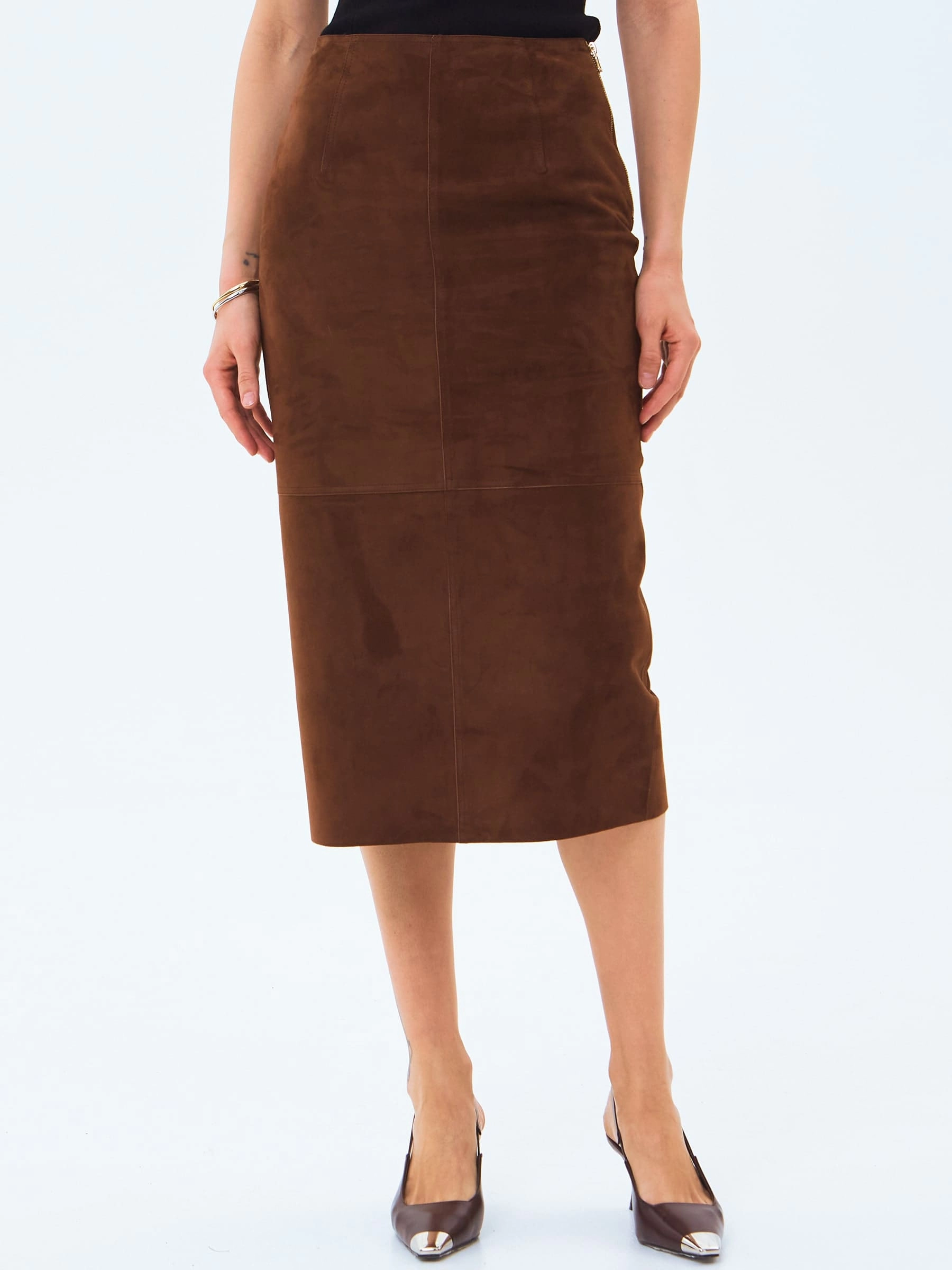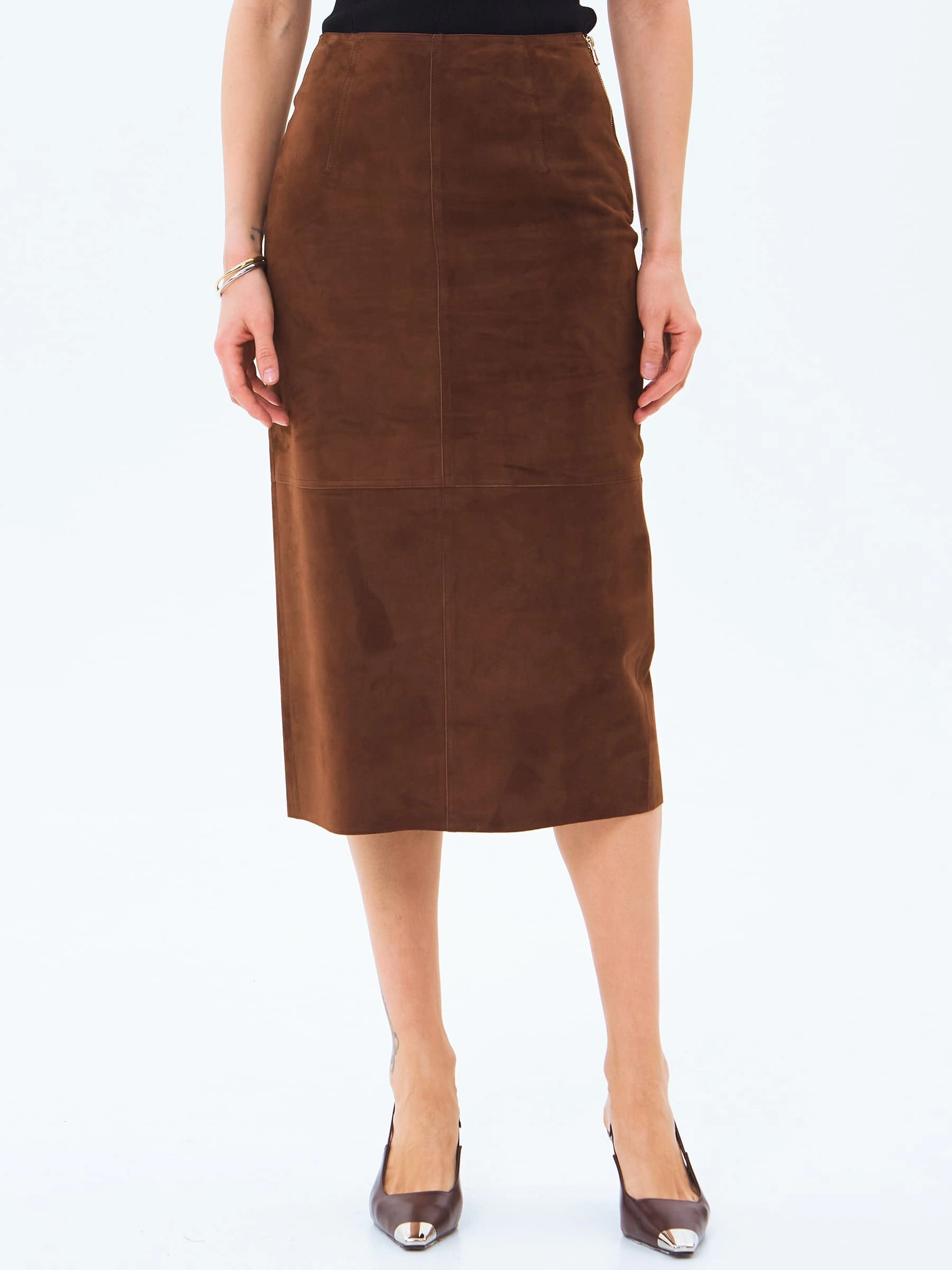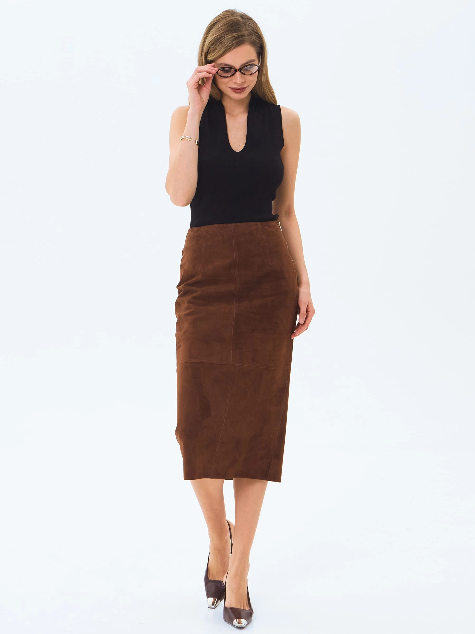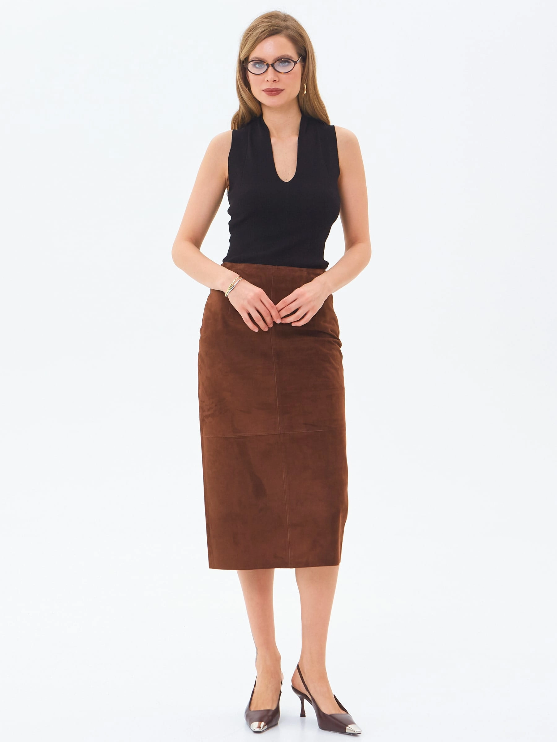 Товар замшевая юбка-миди 18з, коньячная, размер 42, артикул 85990 выполнен из натуральной замши с застежкой молния. Рассчитан на сезон: весна-лето. Длина изделия 77 см, силуэт прямой.