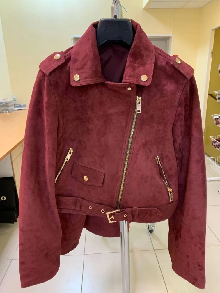 Товар женская замшевая куртка косуха с поясом премиум класса 3080з, бордовая, размер 42, артикул 24740 выполнен из натуральной кожи с застежкой молния. Рассчитан на сезон: весна-лето. Длина изделия 46 см, силуэт прямой.