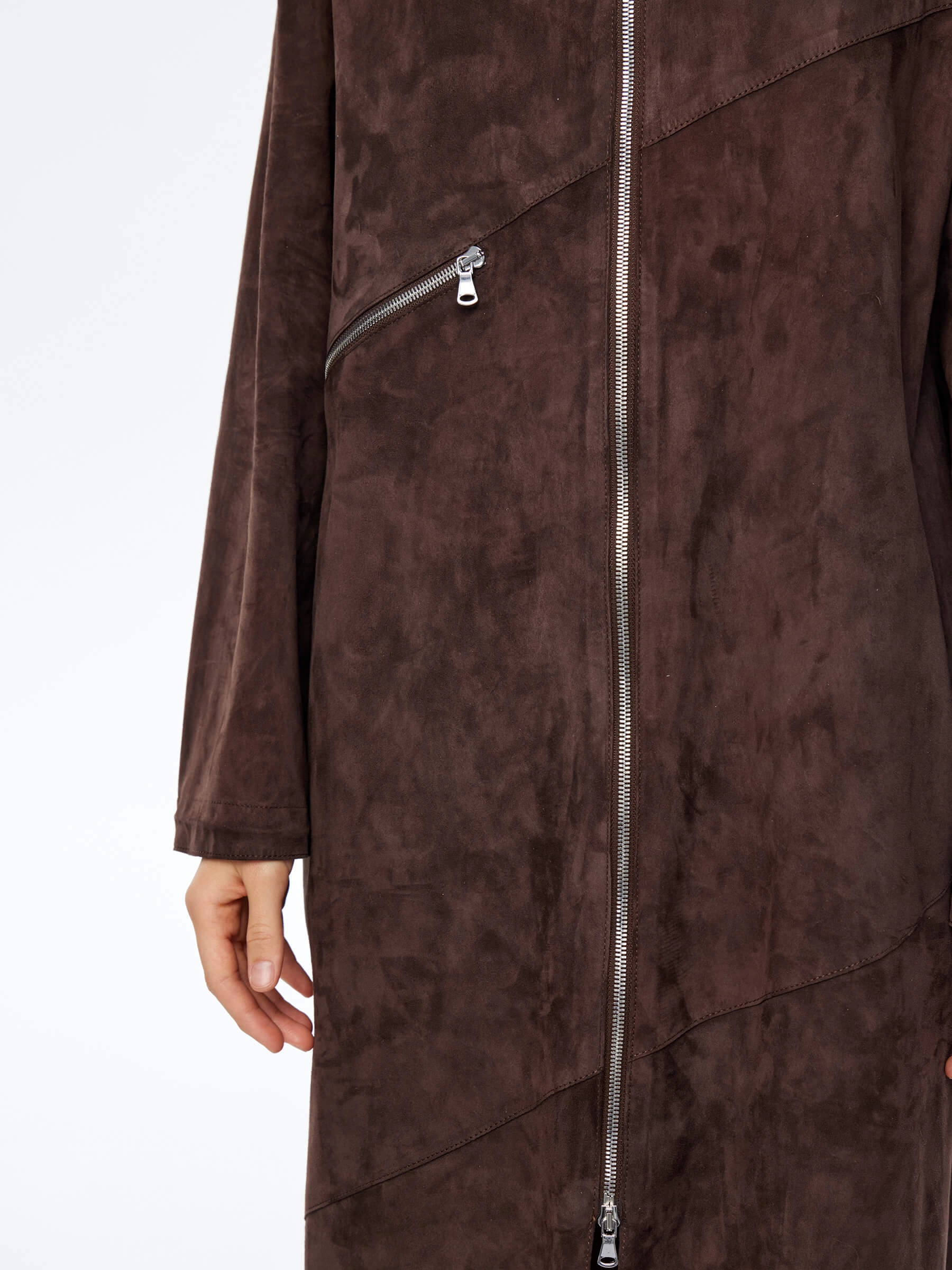 Этот длинный плащ - воплощение стиля и комфорта. Для пошива модели с регулируемыми отложным воротником-стойкой и низом, мастера использовали нежную натуральную замшу премиум класса. Свободный крой, два врезных кармана,боковые разрезы как и сама модель застегиваются крупными молниями. Акцент сделали на асимметричный декоративный карман