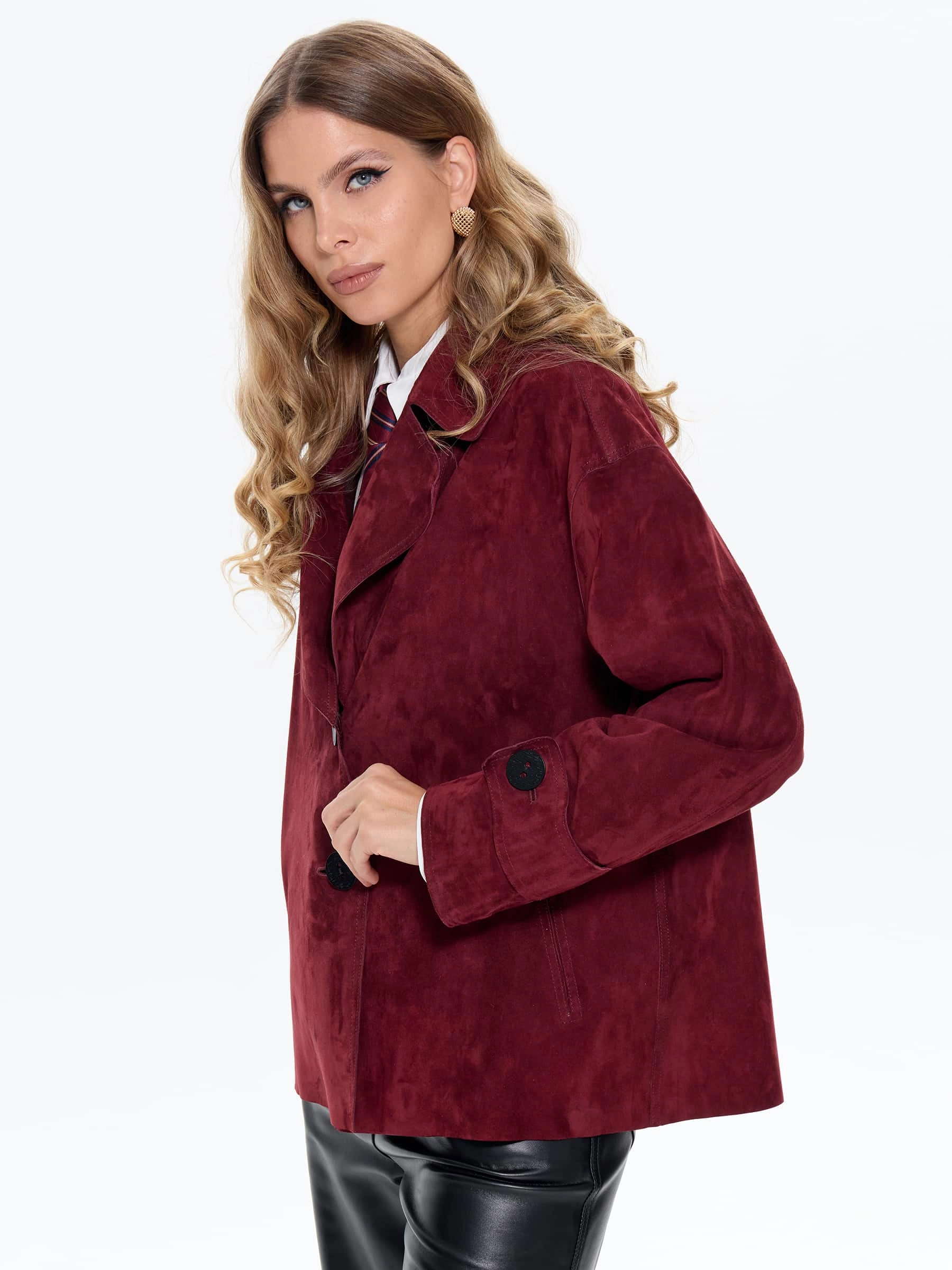 Товар женский замшевый пиджак премиум класса 3097з, бордовый, размер 46, артикул 24730 выполнен из натуральной замши с застежкой пуговицы. Рассчитан на сезон: весна-осень. Длина изделия 66 см, силуэт прямой.