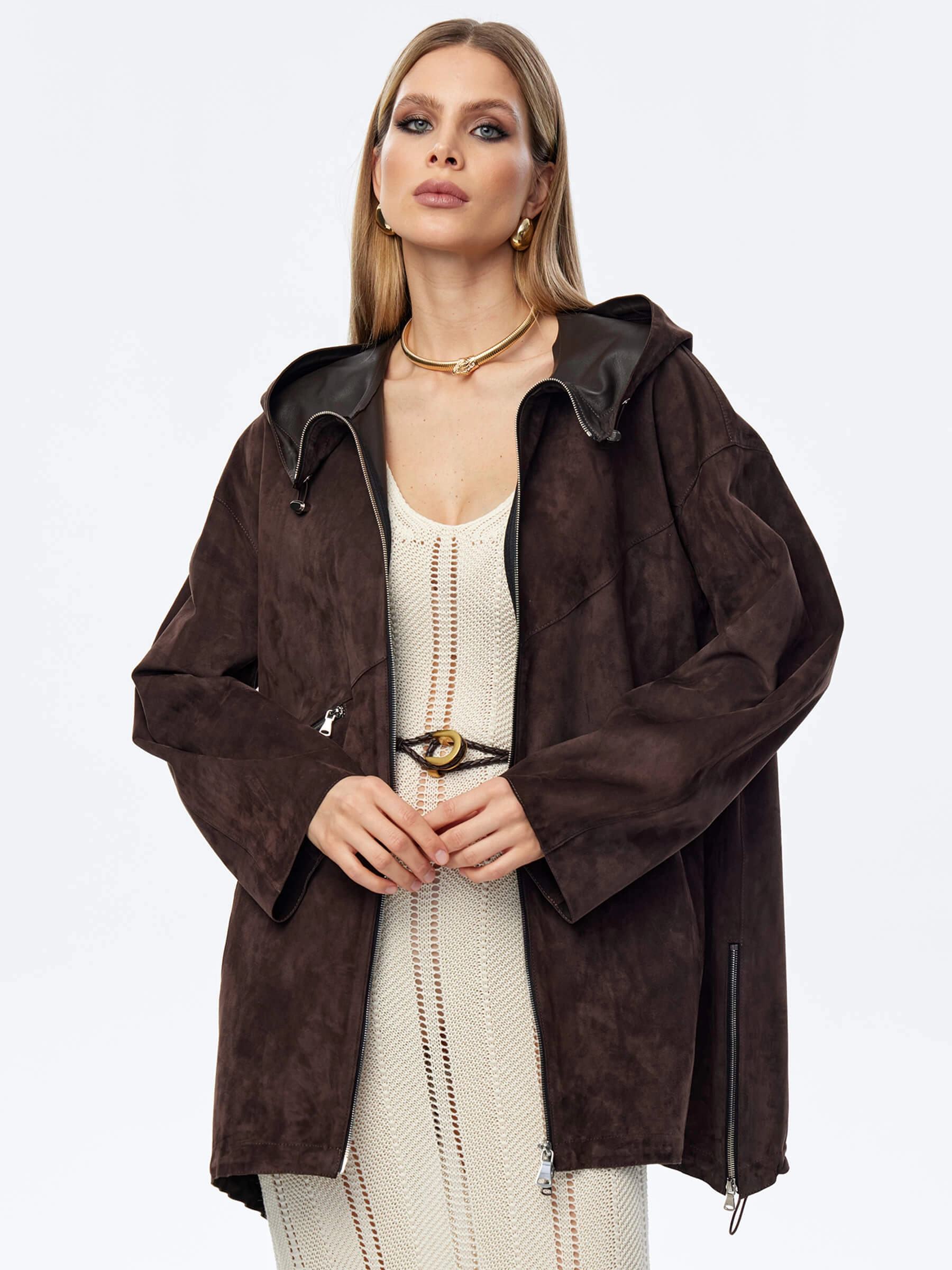 Товар замшевый плащ оверсайз с капюшоном для женщин премиум класса 3053з, коричневый, размер 48, артикул 23980 выполнен из натуральной замши с застежкой молния. Рассчитан на сезон: весна-лето. Длина изделия 75 см, силуэт оверсайз.