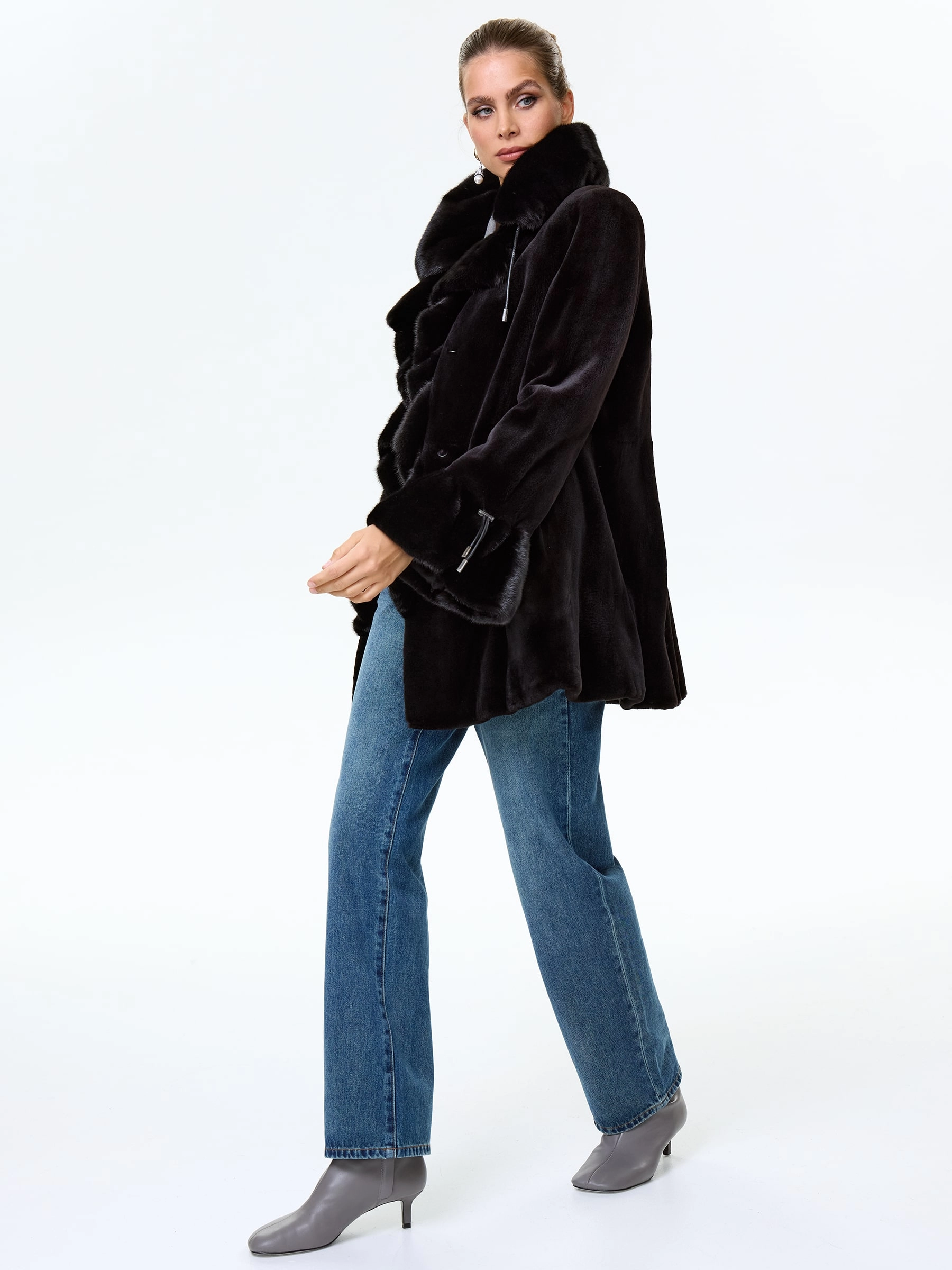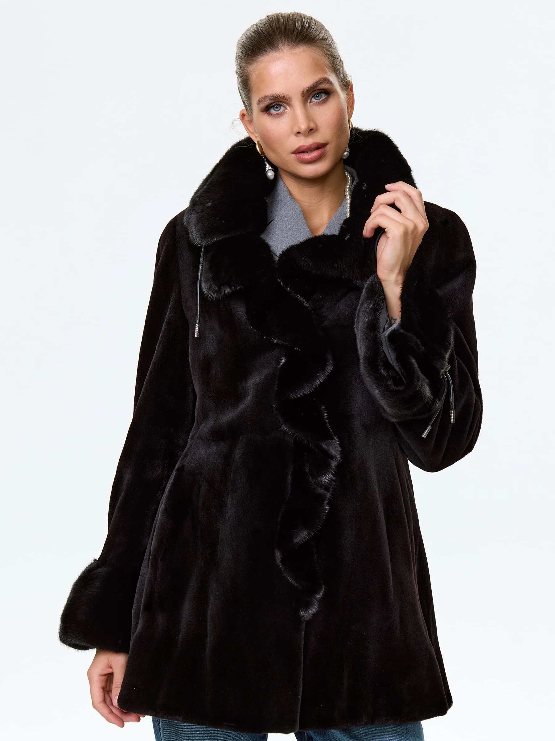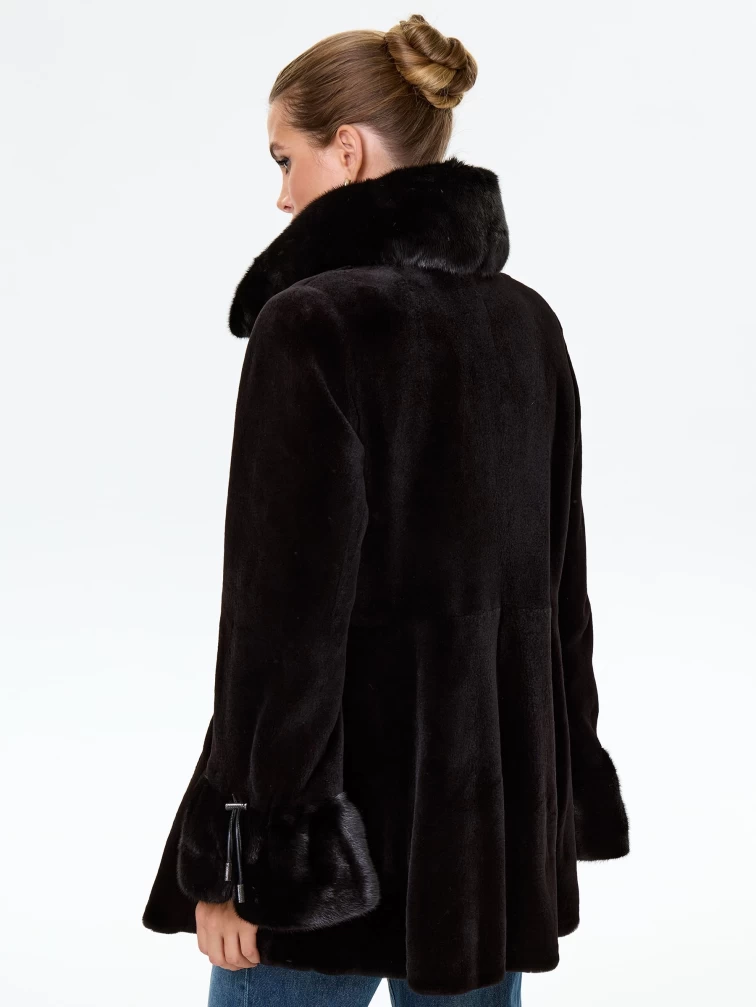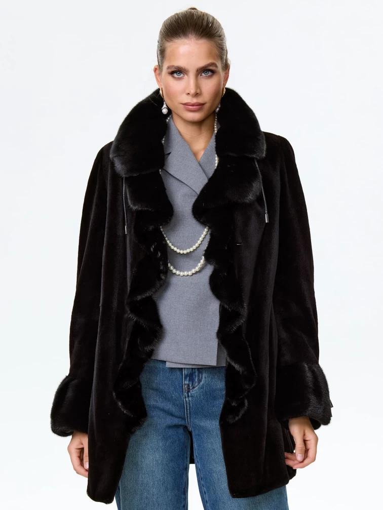 Для пошива этого полупальто использовали бархатистый щипаный мех норки в тандеме с низковорсовой, которой подчеркнули детали изделия. Прямой крой, комфортная посадка по фигуре. Шалевидный воротник и манжеты регулируются кулисками. Застежка-клипсы.