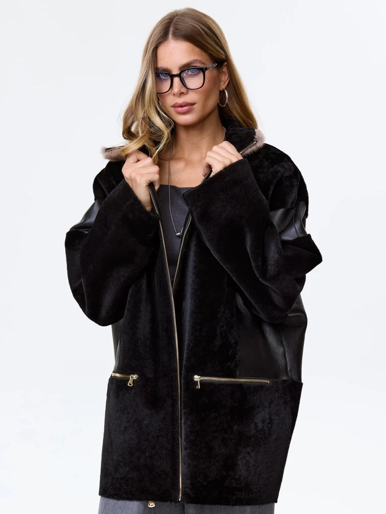 Товар женское полупальто с норковым воротником из натуральной овчины премиум класса 2057, черное, размер 52, артикул 64330 выполнен из овчина "мерино" с застежкой молния. Рассчитан на сезон: осень-зима. Длина изделия 77 см, силуэт свободный.