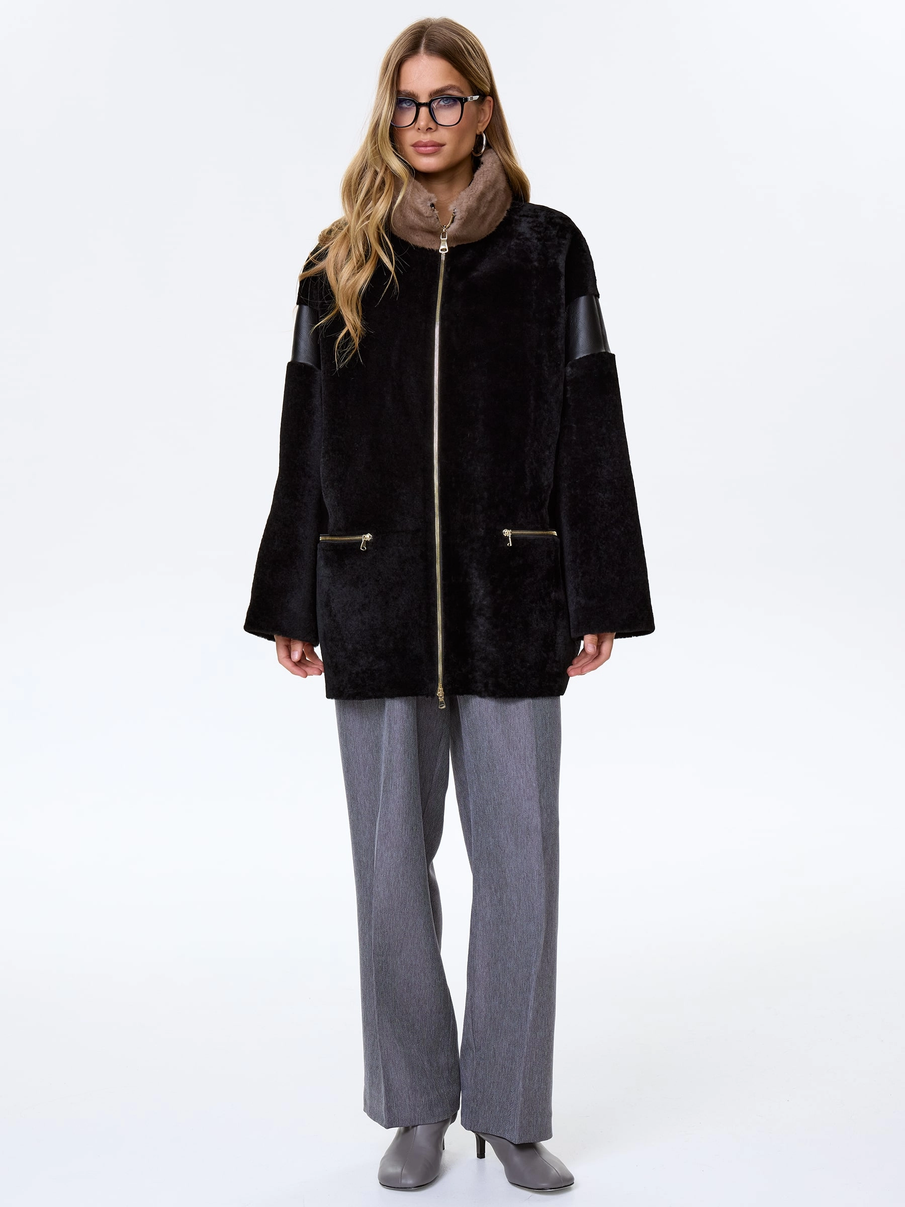 Полупальто свободного кроя выполнили овчины премиум класса в классическом черном цвете. Модель получилась максимально теплой, но при этом легкой и комфортной. Боковые карманы как и само изделие застегиваются молниями. Объемный воротник- стойку дополнили густой норкой.