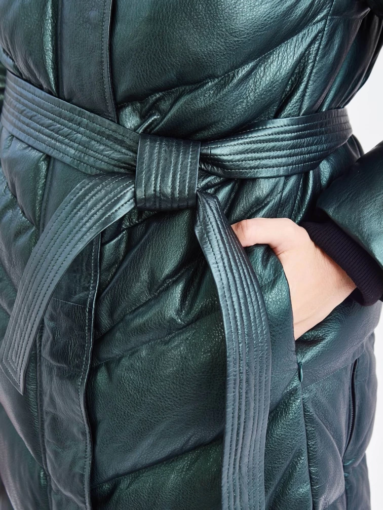 Товар женское стеганое кожаное пальто с меховым капюшоном премиум класса 3048, зеленое, размер 44, артикул 25680 выполнен из натуральной кожи с застежкой молния. Рассчитан на сезон: осень-зима. Длина изделия 97 см, силуэт прямой.