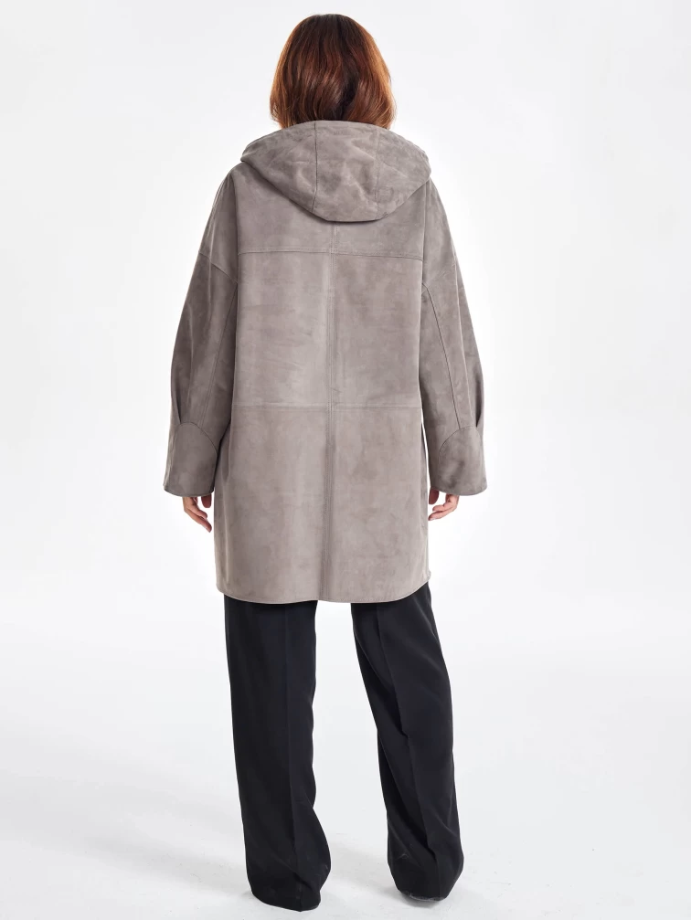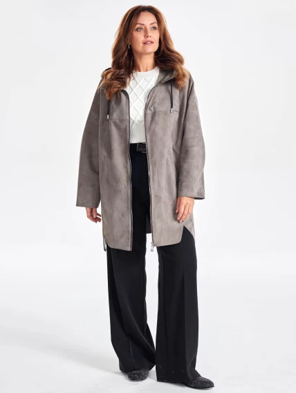 Женское замшевое полупальто оверсайз с капюшоном премиум класса 3059з, серое, размер 52, артикул 64050