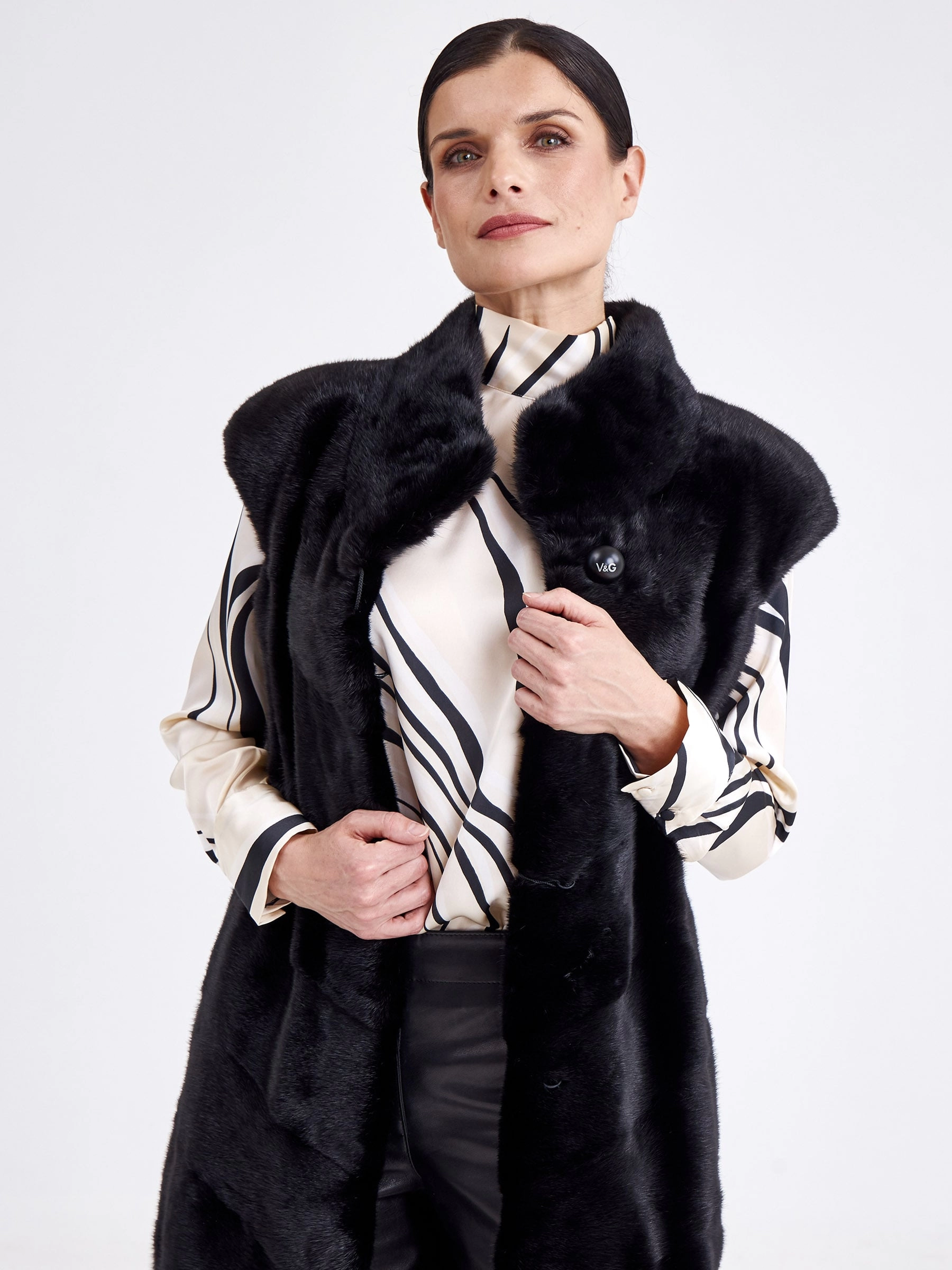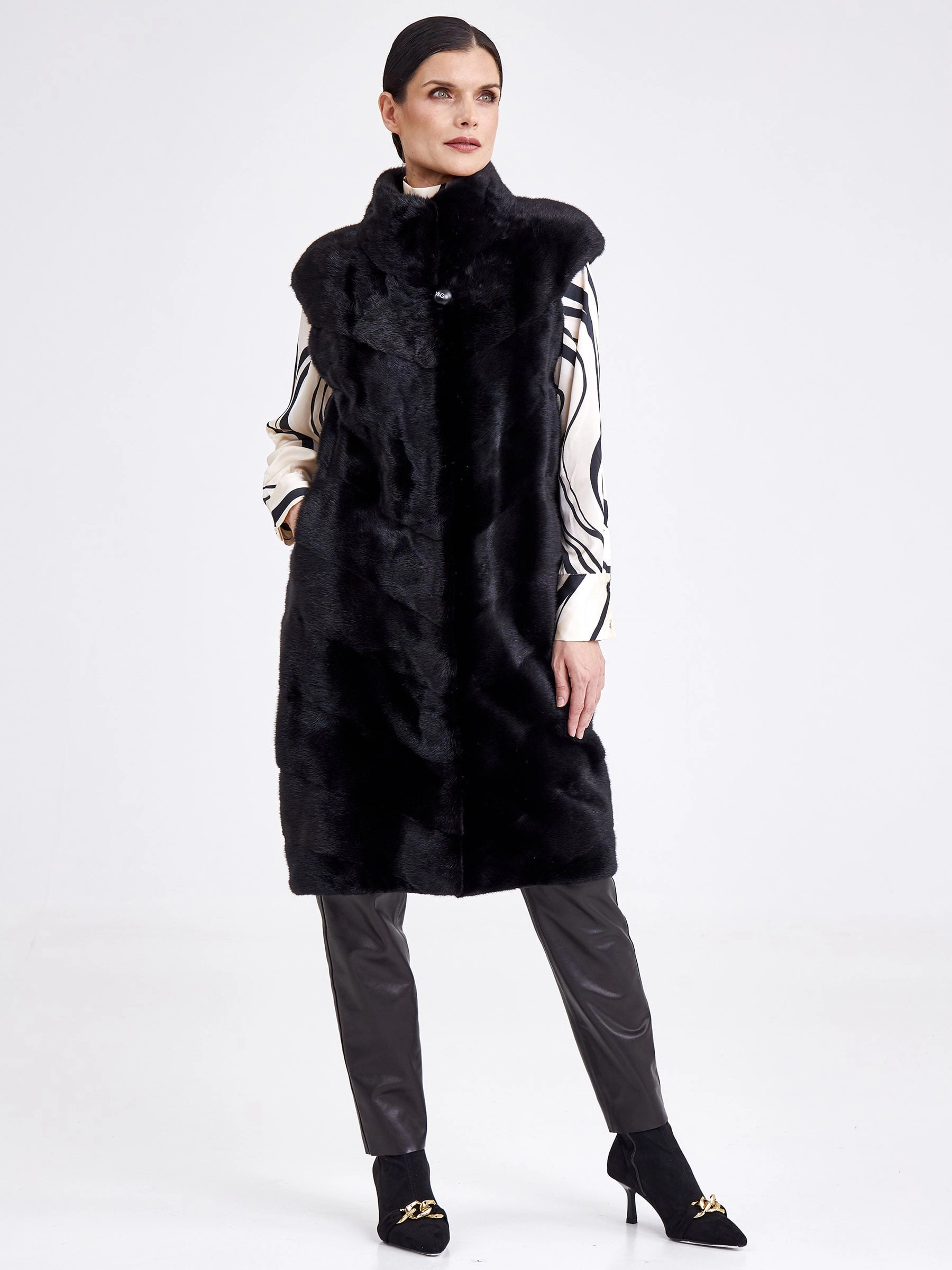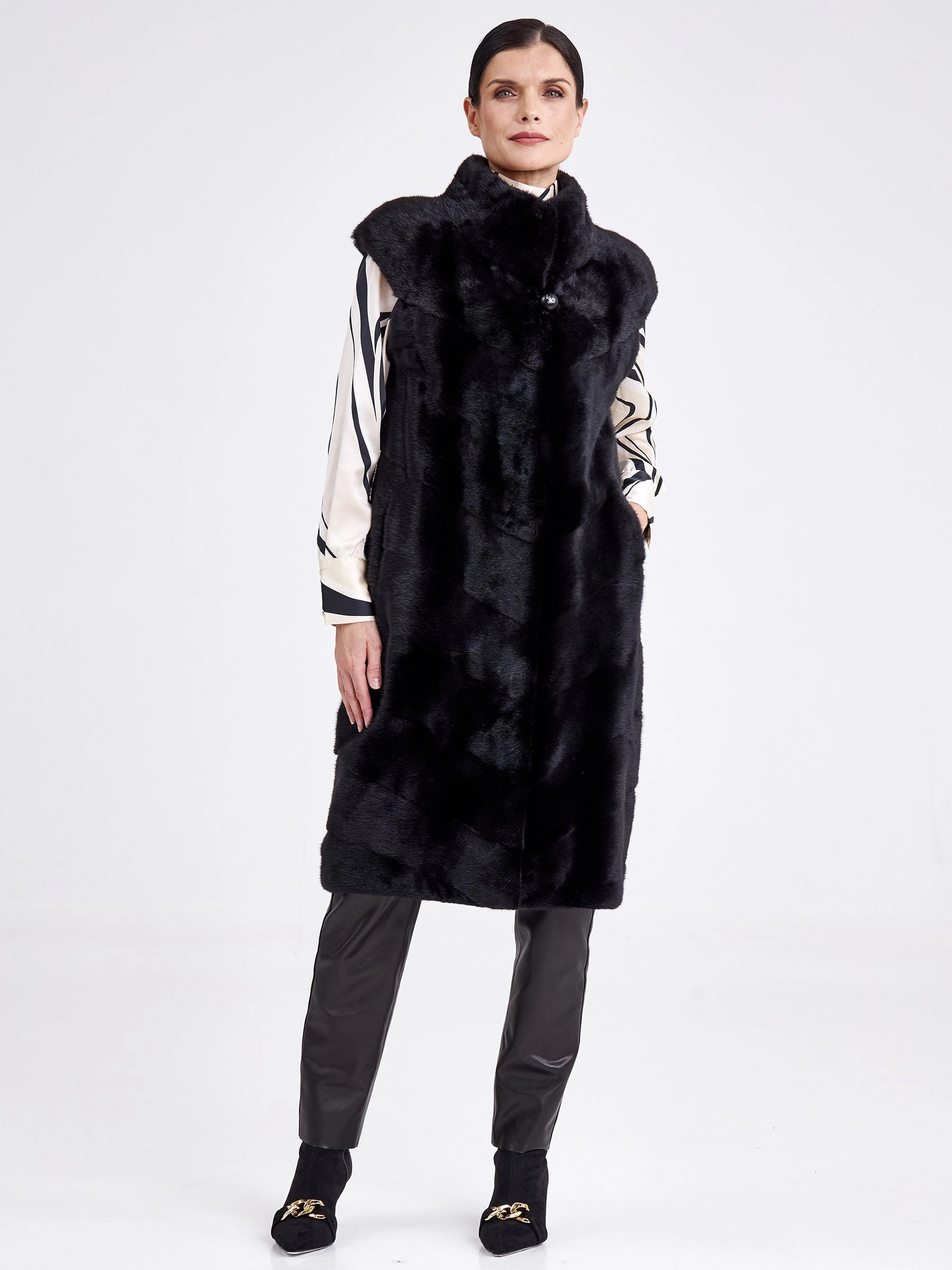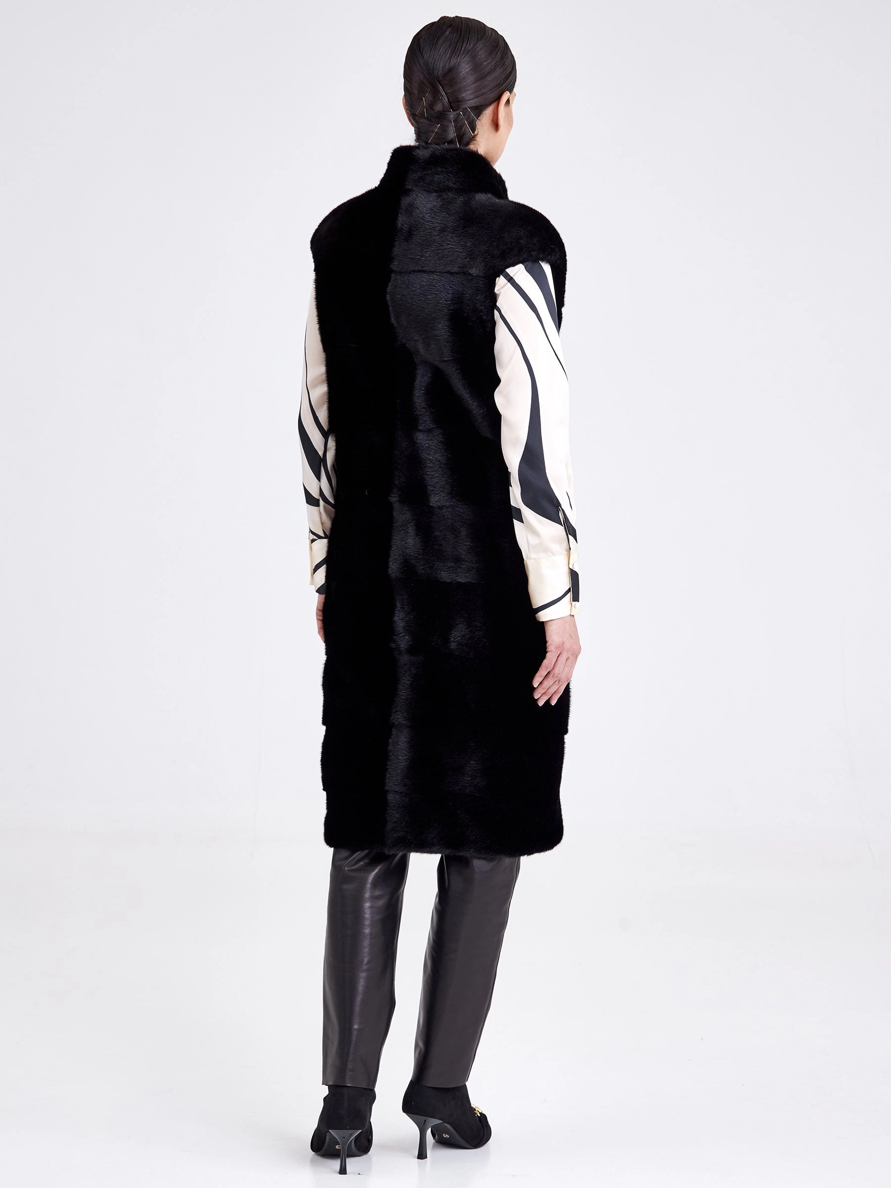 Длинный жилет-это отличное дополнение к образу. Изделие сшили из нежного густого меха норки. Универсальный черный цвет, прямой крой, миниум фурнитуры и полное отсутствие декора. Горизонтальная раскладка меха.Идеальное сочетание с кожаными брюками,юбкой.