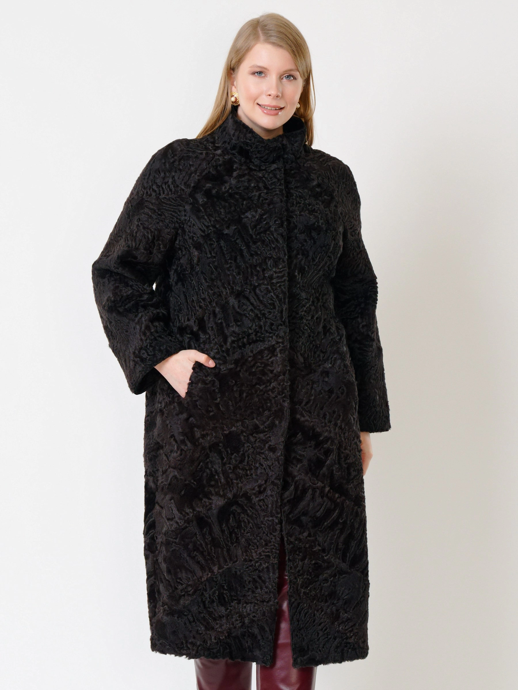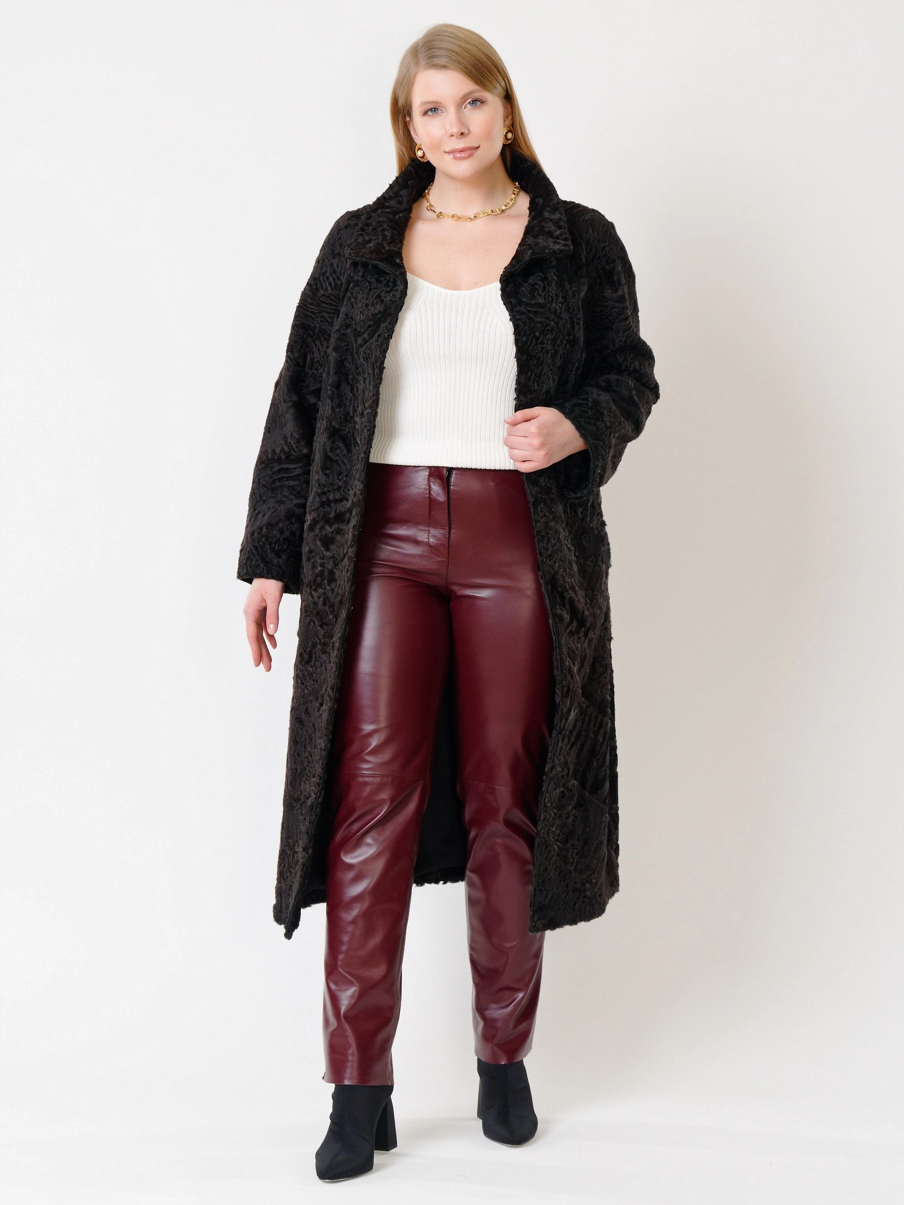 Зимний комплект женский: Шуба из каракуля 17101 + Брюки 02, коричневый/бордовый, р. 44, арт. 111316